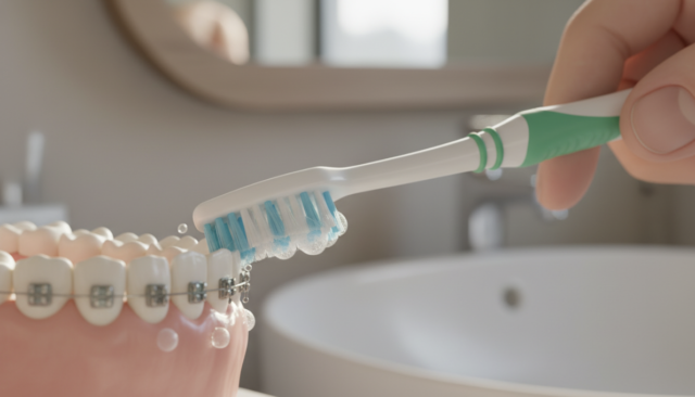 そのため、食事のたびに装置の周囲に食べ物のかすが付着しやすく、特に繊維質の多い野菜や肉類は装置に絡みやすい傾向があります。歯ブラシだけでは汚れを完全に除去することが難しく、歯間ブラシやワンタフトブラシなどの補助的な清掃用具が必要不可欠です。