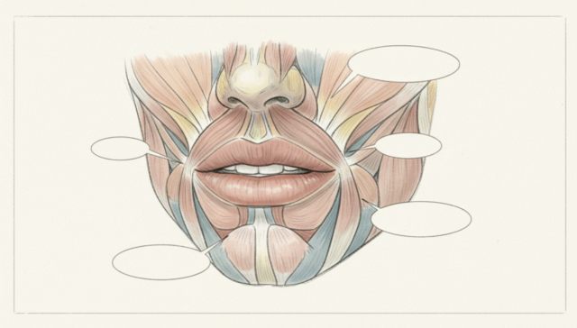 「表情筋」は顔のさまざまな箇所を動かす筋肉の総称で、皮膚のすぐ下に位置して顔全体を内部から支えています。口輪筋、頬筋、上唇挙筋、オトガイ筋など、口周りには特に重要な筋肉が集まっています。これらの筋肉が衰えることで顔全体の皮膚が下がり、ほうれい線が目立ちやすくなる傾向があります。